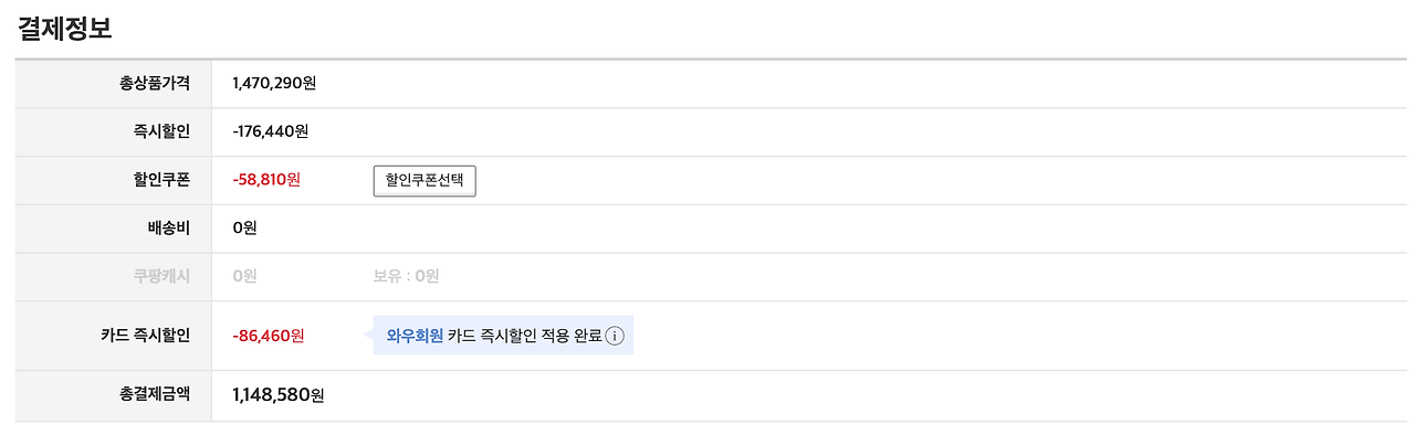 쿠팡 와우쿠폰 할인가 1,235,040원에서 카드 최대 할인시 최종 1,148,580원에 구매가능하네요.
