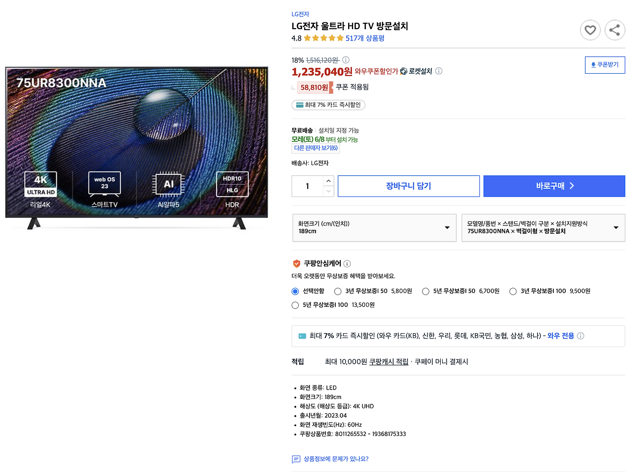 #LG #LG전자 #4K #UHD #75인치 #TV #75UR8300NNA #75인치TV #LGTV #핫딜 #특가 #쿠팡 #벽걸이 #벽걸이형 #로켓설치