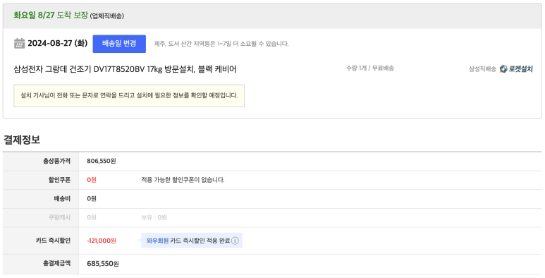 | 삼성전자 그랑데 세탁기 21kg + 건조기 17kg + 직렬설치 키트 1,582,530원 (0) | 2024.08.27 |