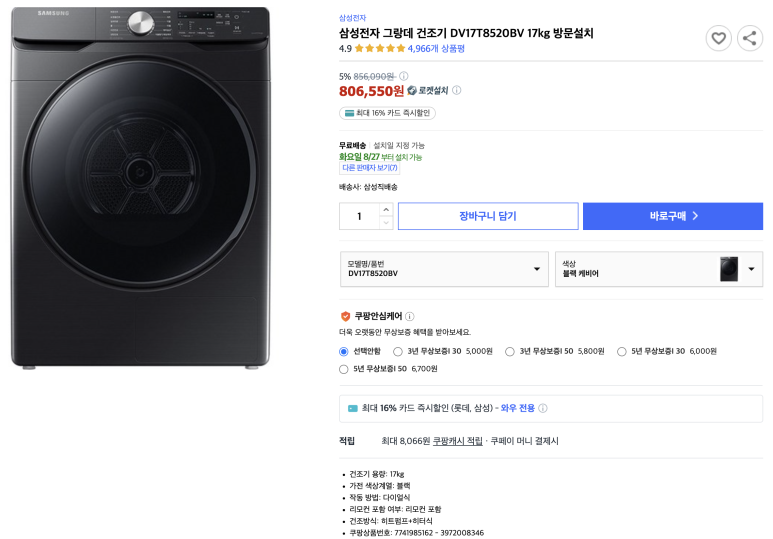 삼성전자 그랑데 건조기 DV17T8520BV 17kg 방문설치 - 세탁기 | 쿠팡