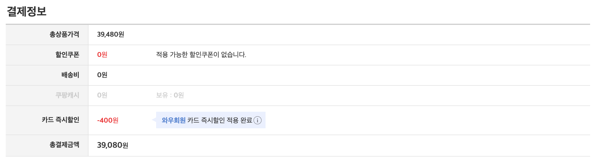 쿠팡 와우쿠폰 할인가 39,480원에서 카드 최대 할인시 최종 39,080원에 구매가능하네요.