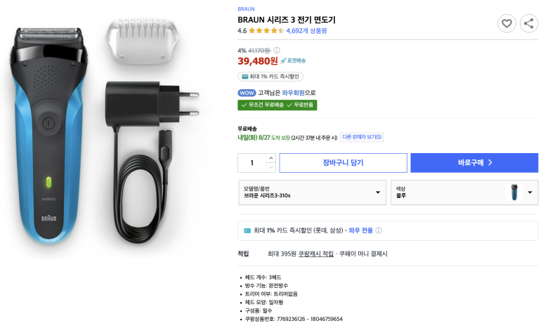 현재 별점 4.6점, 리뷰 4,692개를 가진 BRAUN 시리즈 3 전기 면도기! 지금 쿠팡에서 더 저렴하고 다양한 이미용가전 제품들을 확인해보세요.
