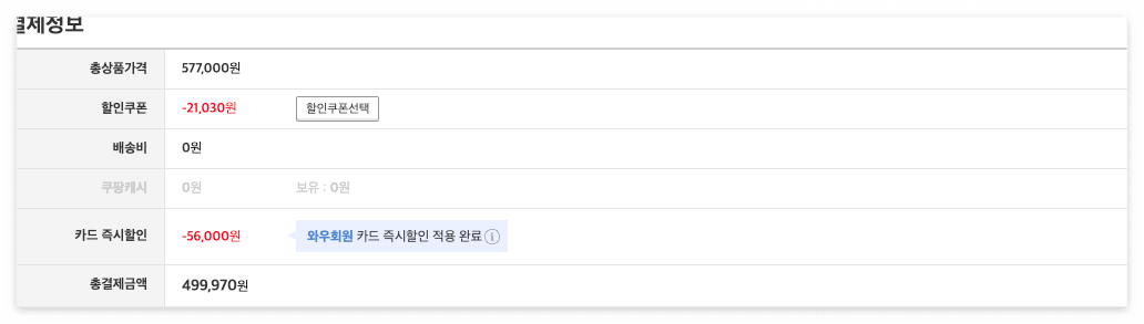 쿠팡 와우쿠폰 할인가 555,970원에서 카드 최대 할인시 최종 499,970원에 구매가능하네요.