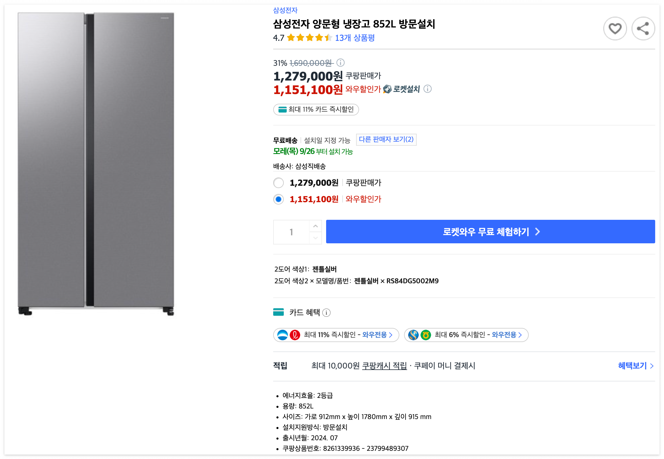 삼성전자 양문형 냉장고 852L 방문설치 - 2도어 냉장고 | 쿠팡
