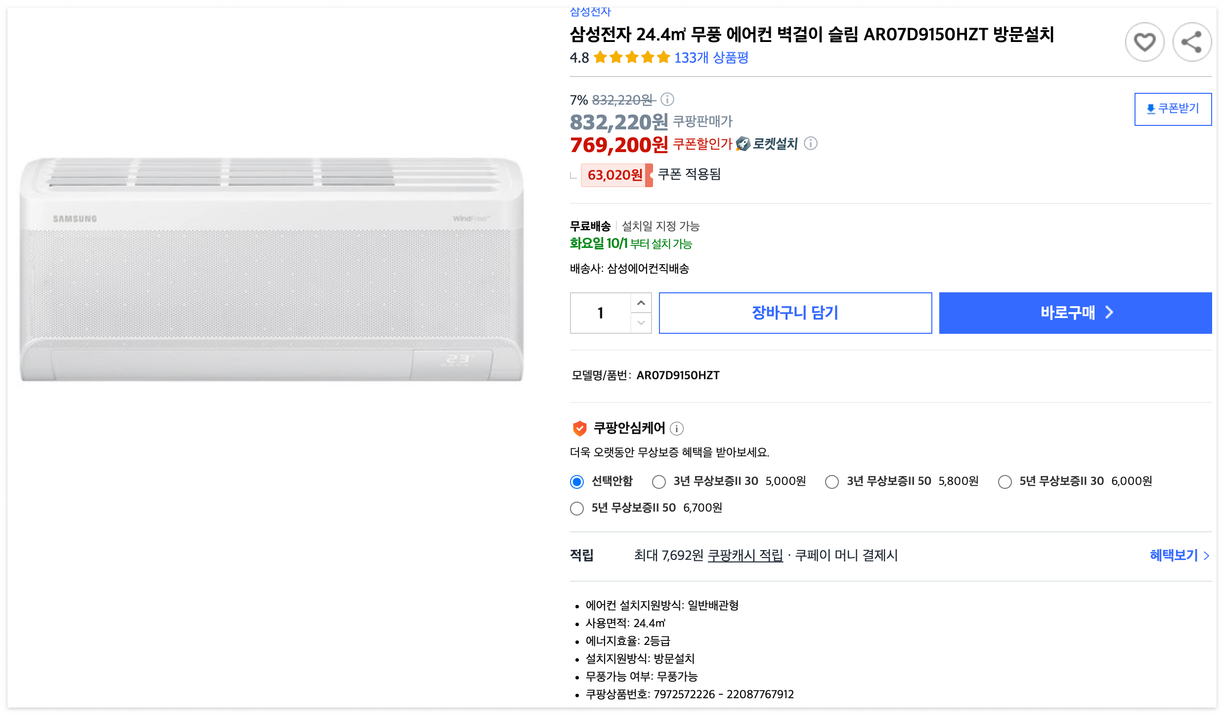 현재 별점 4.8점, 리뷰 133개를 가진 삼성전자 24.4㎡ 무풍 에어컨 벽걸이 슬림 AR07D9150HZT 방문설치! 지금 쿠팡에서 더 저렴하고 다양한 벽걸이형 제품들을 확인해보세요.