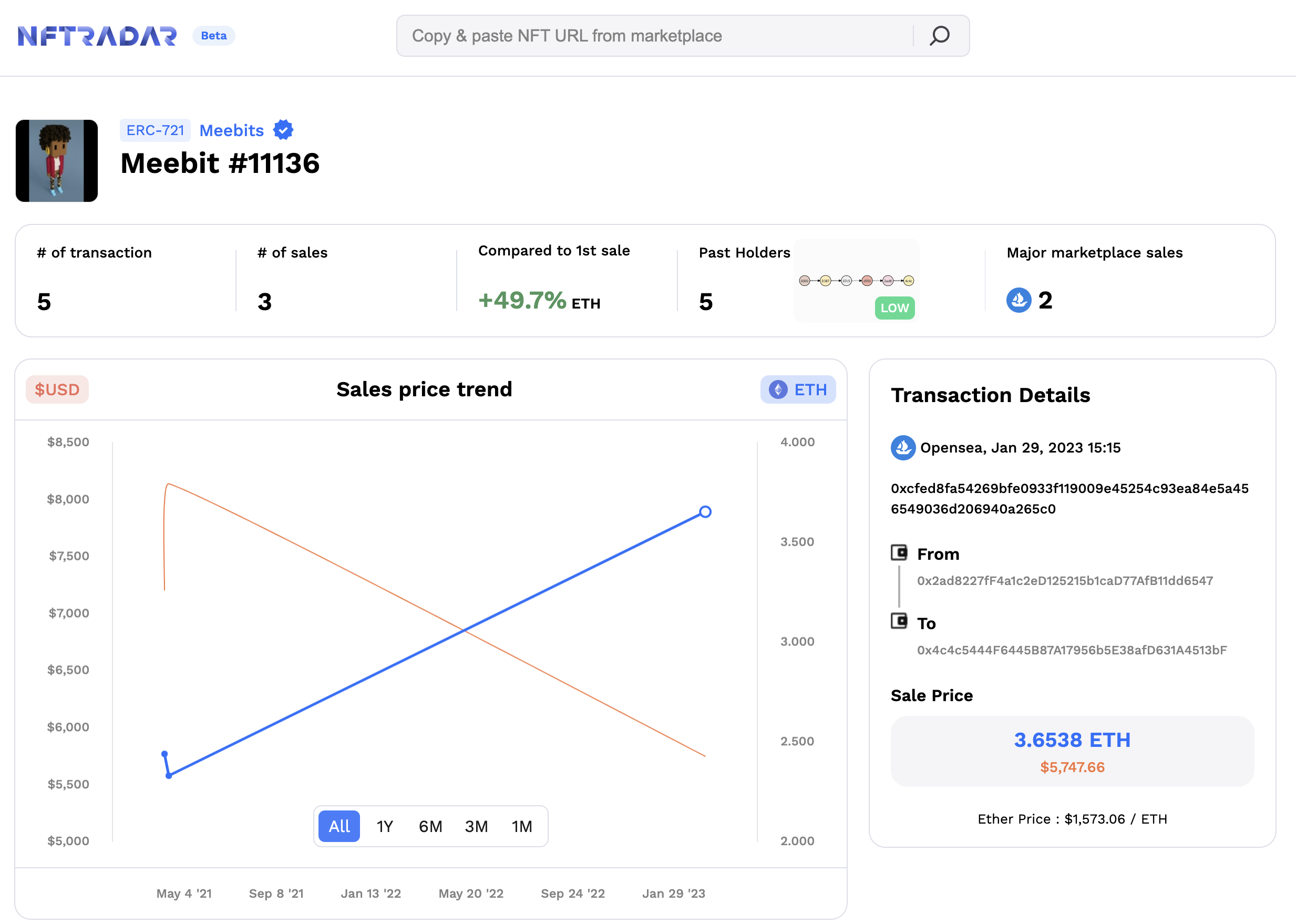 아래 예시는 Meebit #11136 NFT 거래 정보를 NFT RADAR를 통해 조회한 결과인데요. 좌측 하단 그래프를 보면 ETH의 거래가 추이는 물론 당시 USD금액으로 환산된 거래가 그래프를 같이 확인할 수 있어서 Crypto Currency가 아닌 Fiat Currency로도 내역을 쉽게 확인할 수 있습니다. 이 Meebit NFT의 경우, ETH 판매가는 직전 거래 대비 상승했지만, USD로 봤을 때는 반대로 떨어진 걸 확인하실 수 있는데요. NFT가 가상 화폐로 거래되다보니 가상 화폐의 등락에 따라 NFT 실제 가치와는 상관없이 가격 등락이 있는 특성이 있는데 이 부분을 NFT 잠재 구매자에게 쉽게 알려주는 아주 유용한 기능인 것 같습니다.