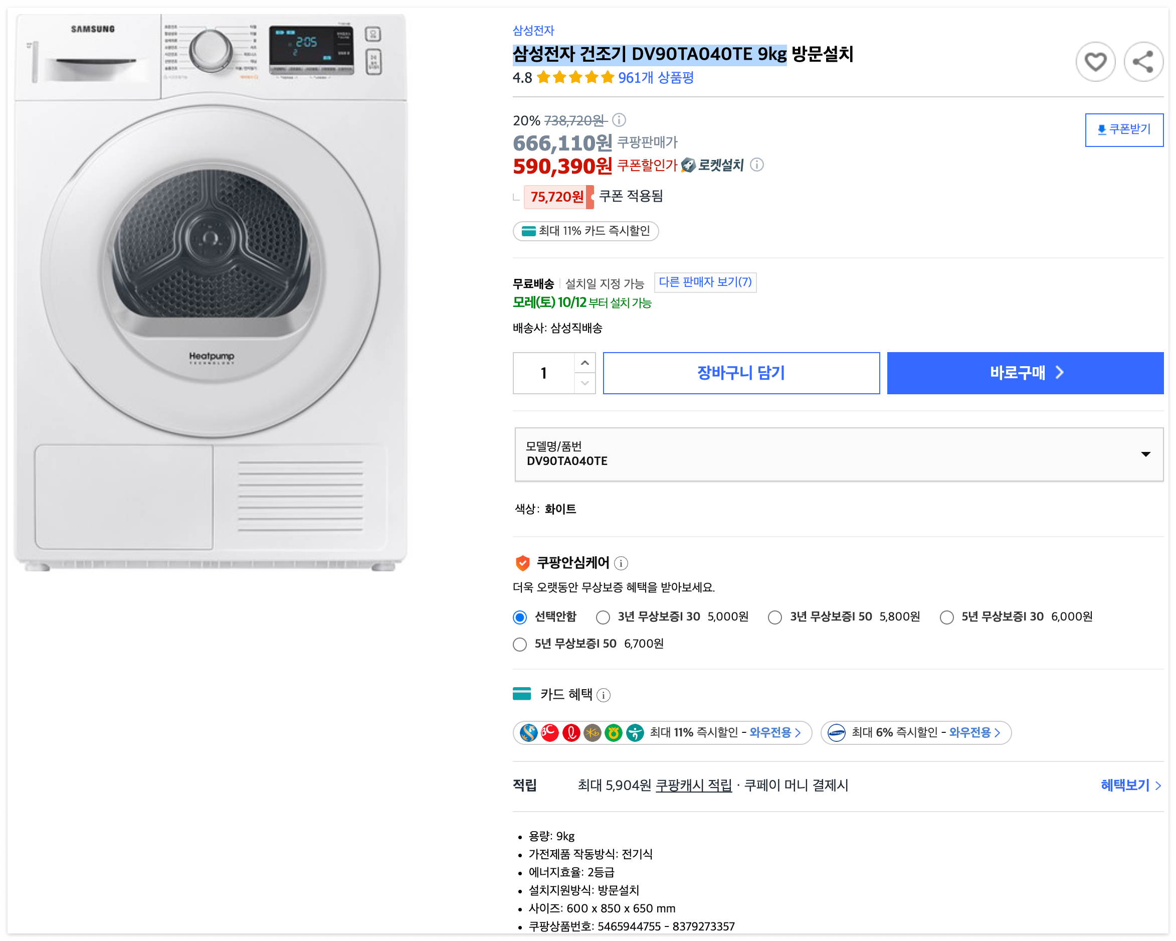 현재 별점 4.8점, 리뷰 961개를 가진 삼성전자 건조기 DV90TA040TE 9kg 방문설치! 지금 쿠팡에서 더 저렴하고 다양한 건조기 제품들을 확인해보세요.