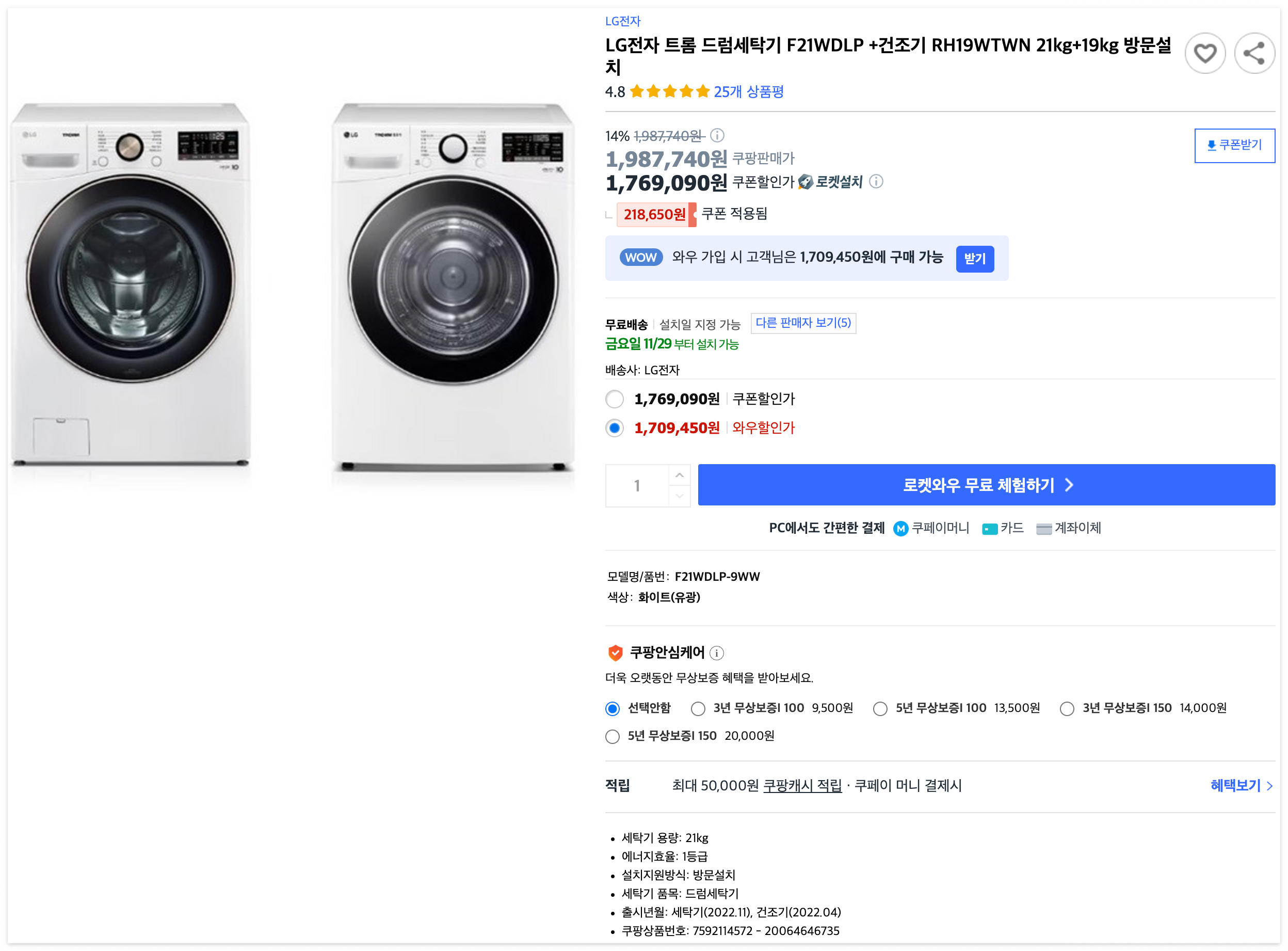 LG전자 트롬 드럼세탁기 F21WDLP +건조기 RH19WTWN 21kg+19kg 방문설치 - 세탁기건조기세트 | 쿠팡