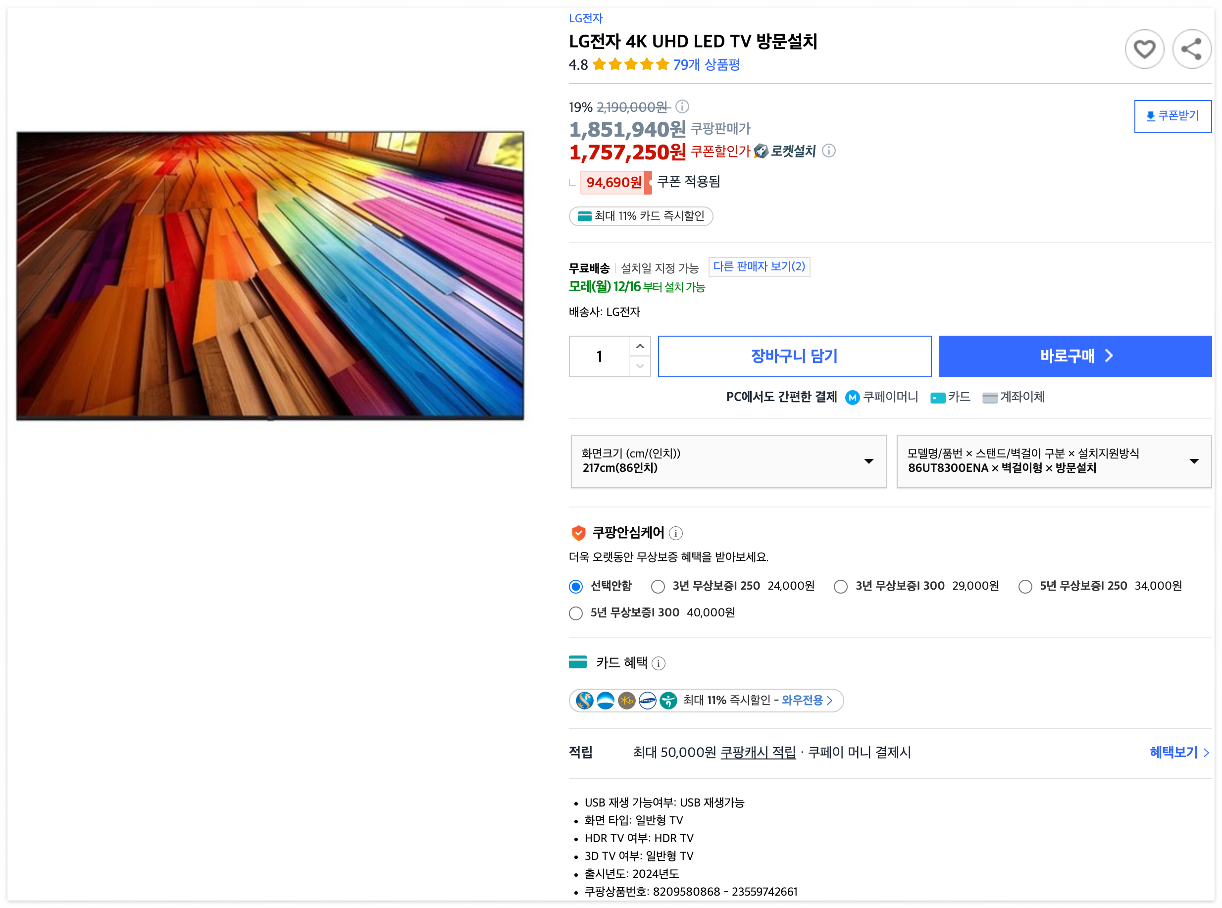 #LG #LG전자 #4K #UHD #86인치 #TV #86UT8300ENA #LGTV #핫딜 #특가 #쿠팡 #벽걸이 #벽걸이형 #로켓설치